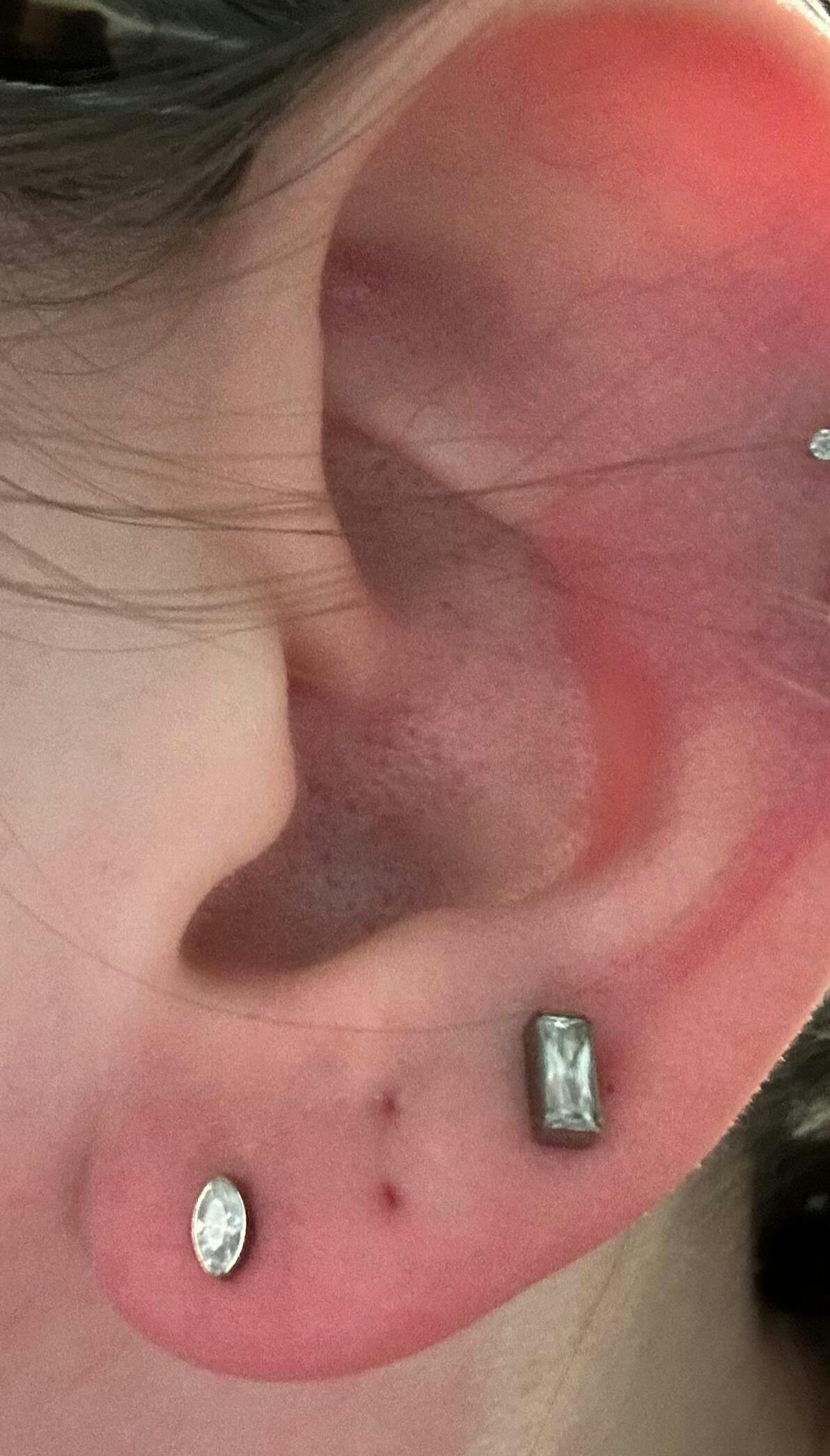I have this earring in a cartilage piercing on the top of my ear. I had a regular earring in it and it was causing all kinds of problems! This earring is perfect! My ear is healing and I can now sleep with no pain!