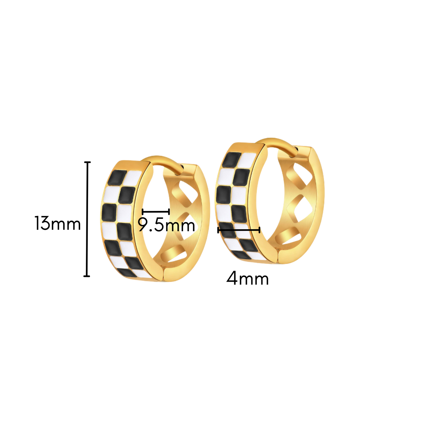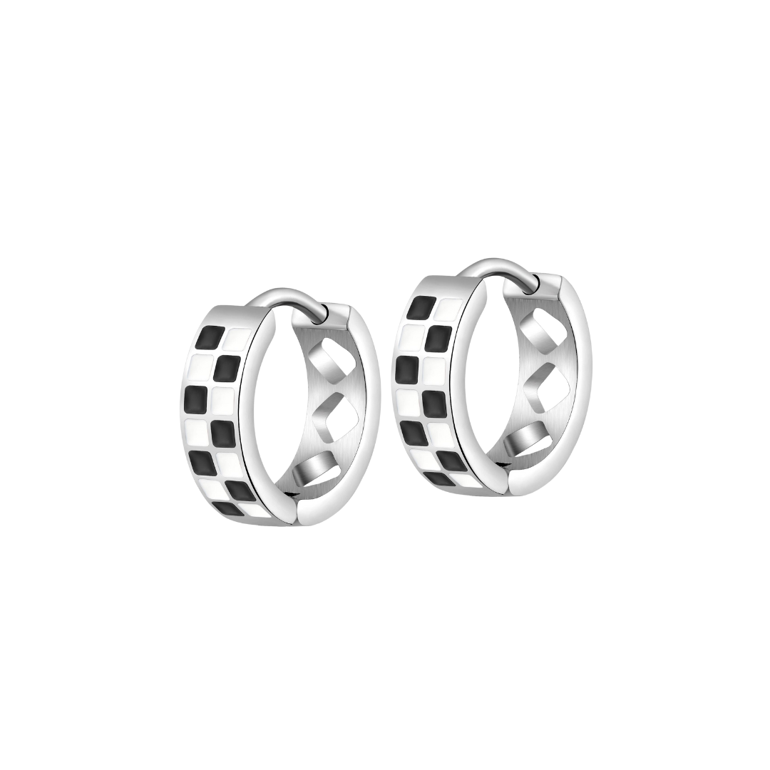 Upgrade your earring collection with our Black and White Checkered Titanium Hoops. These hoops feature an easy click on and off mechanism and a unique fun shape design in the back, making them both stylish and practical. Crafted from durable titanium, they are also comfortable to wear all day long.