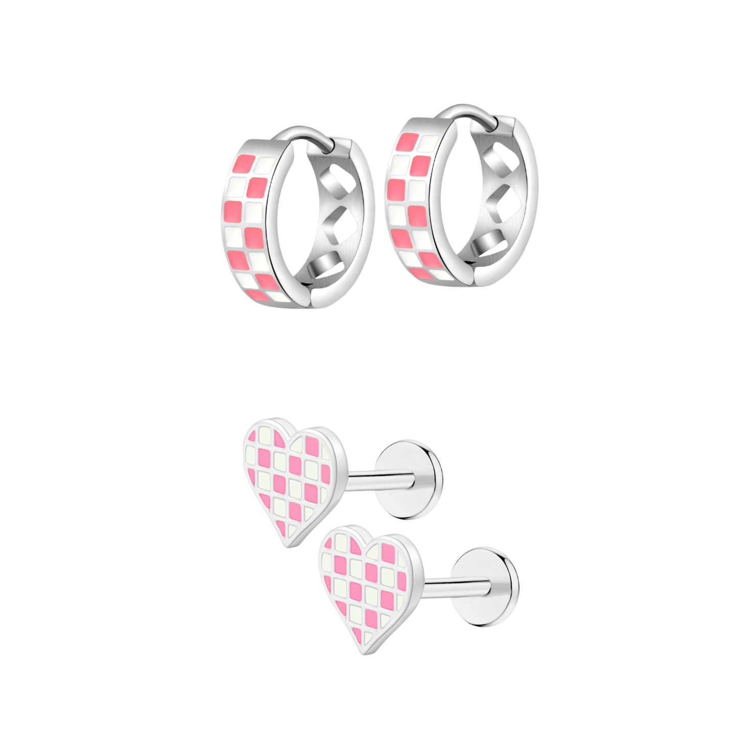 - One pair of Pink Checkered Heart Enamel Flat Back Studs